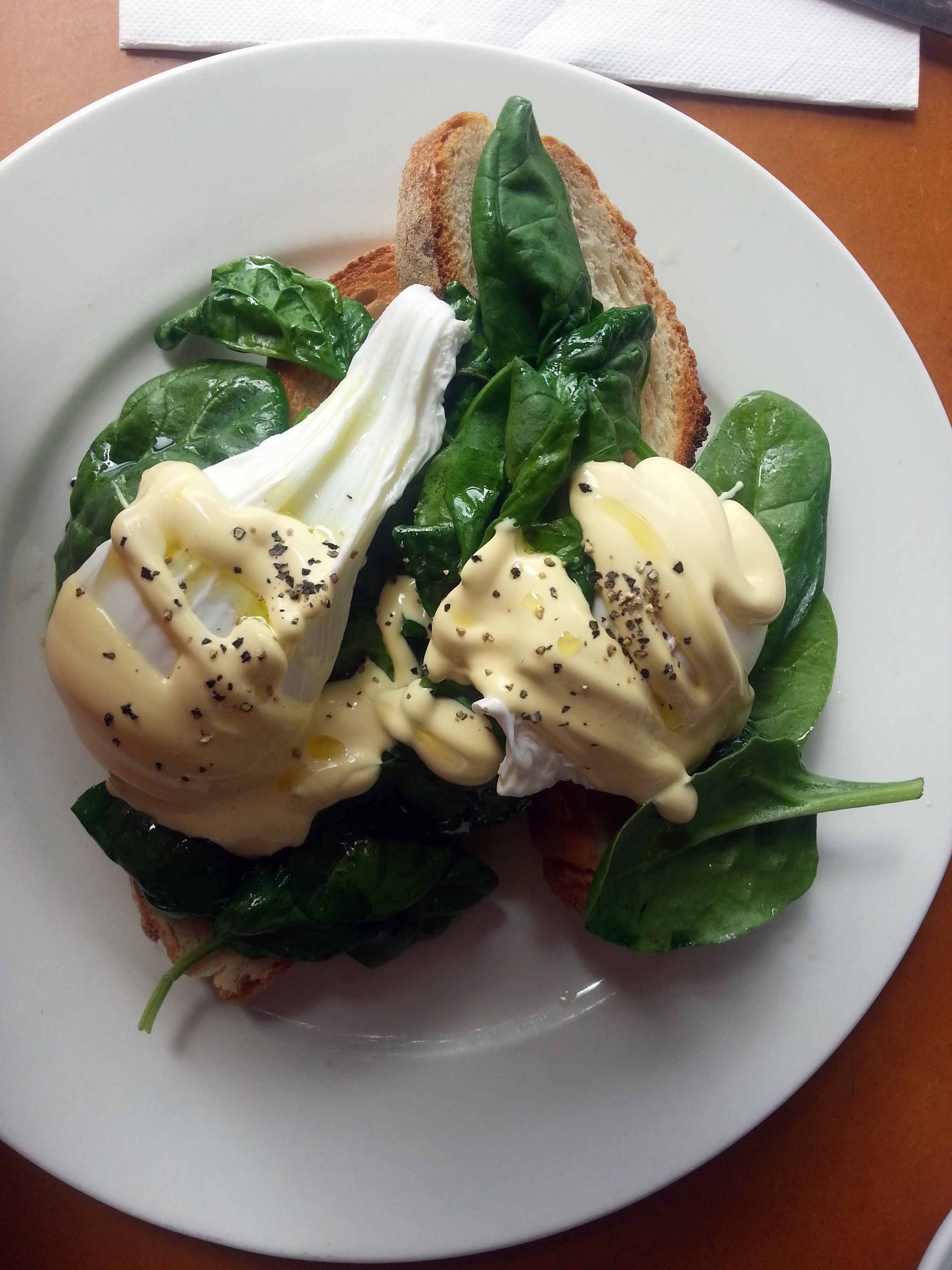 Fortunately on the Saturday morning we visited Hawker Street Café, our situation wasn’t dire, which was lucky as I don’t think Hawker Street is licensed. Coffees were all we needed to get us into gear for the day ahead. And what a coffee! Hawker Street sure knows how to get this right; perfect strength, temperature and flavour mmmm. I had one of my sinful veggie brunch favourites; Eggs Florentine. The (free range) eggs were soft and runny on a bed of perfectly wilted spinach, which was obviously fresh rather than frozen. The only drawback was that the hollandaise sauce (the pièce de résistance) was apparently not home made. This was a shame, however it still was a lovely breakfast.
